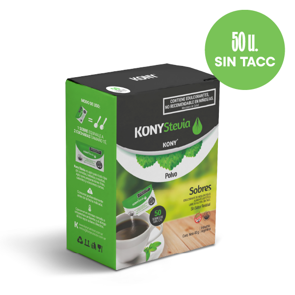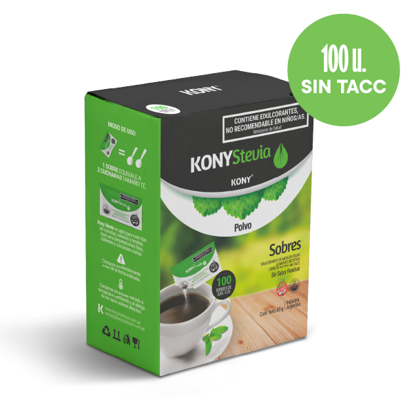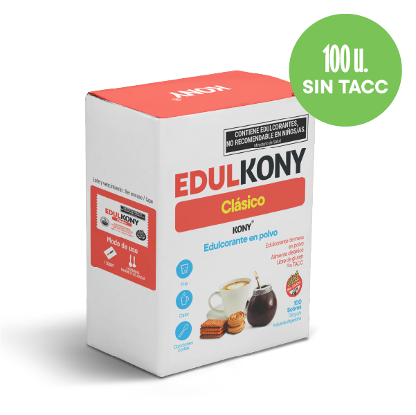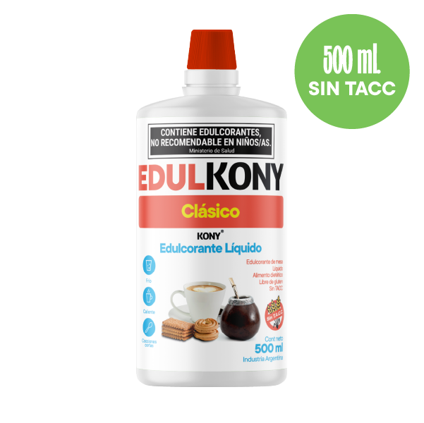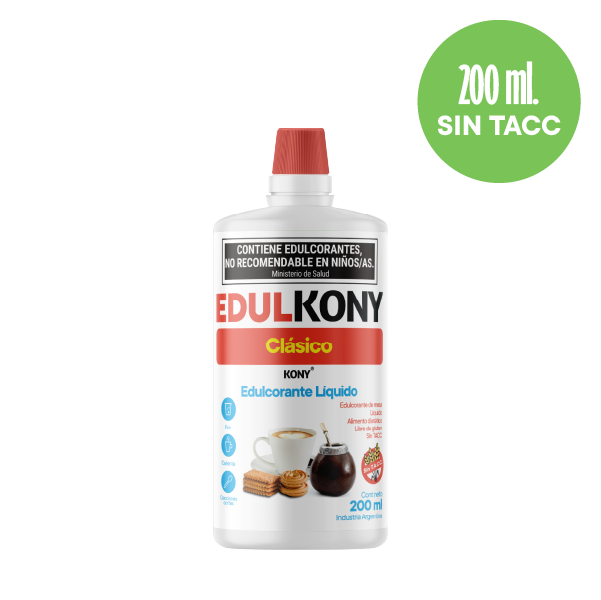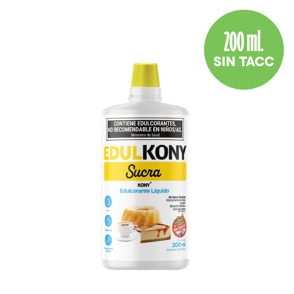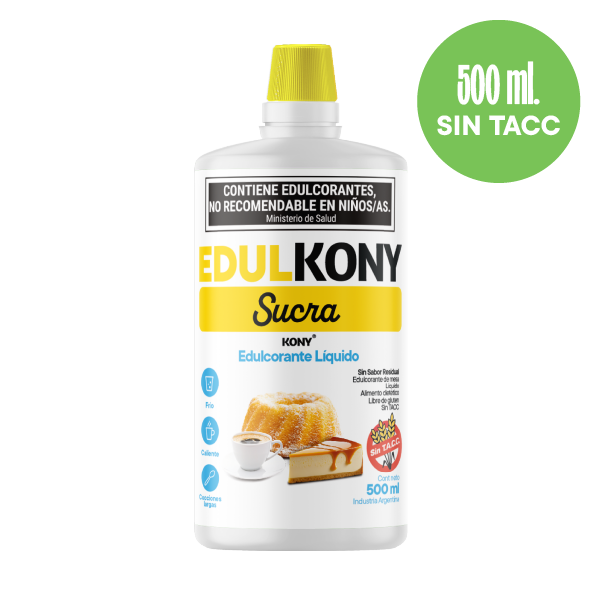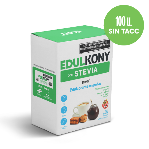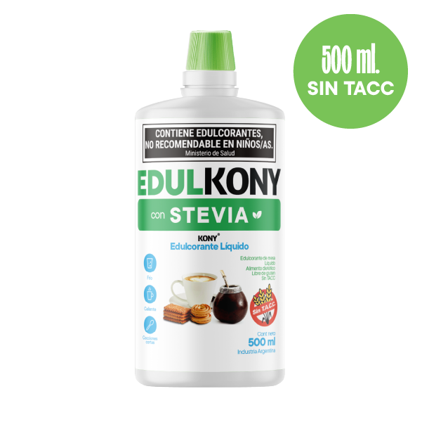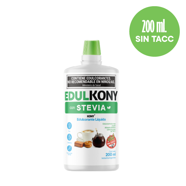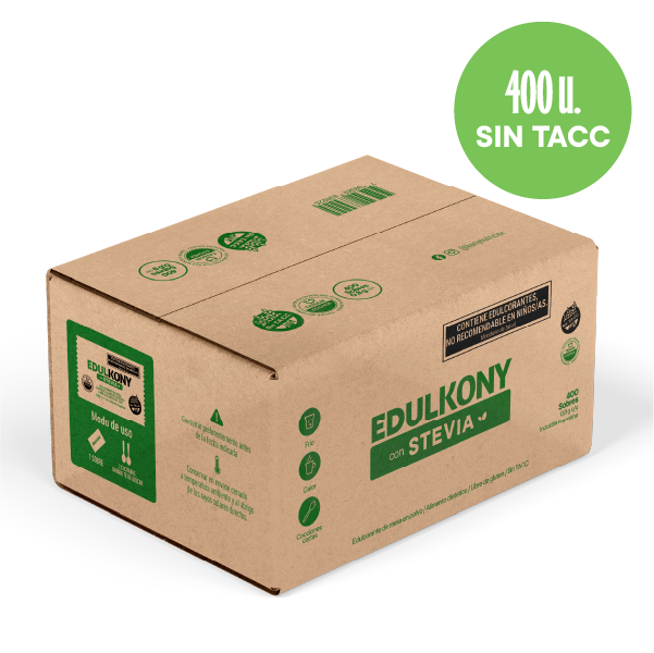 Stevia 100ml 100ml Líquido SIN TACC Certificación Kosher 20 unidades por pack Stevia 200ml 200ml Líquido SIN TACC Certificación Kosher 12 unidades por pack Stevia 500ml 500ml Líquido SIN TACC Certificación Kosher 6 unidades por pack Stevia Polvo 90gr Polvo SIN TACC Certificación Kosher 16 unidades por pack Stevia sobres 50u 50 unidades Sobres SIN TACC Certificación Kosher 10 unidades por pack Stevia sobres 100u 100 unidades Sobres SIN TACC Certificación Kosher 10 unidades por pack Stevia sobres 400u 400 unidades Sobres SIN TACC Certificación Kosher 1 unidad por pack Stevia sobres 800u 800 unidades Sobres SIN TACC Certificación Kosher 1 unidad por pack Stevia Life 200ml 200ML Líquido SIN TACC Endulzado 100% con Stevia Certificación Kosher 12 unidades por pack Edulkony Clásico 200ml 200ml Líquido SIN TACC Certificación Kosher 12 unidades por pack Edulkony Clásico 500ml 500ml Líquido SIN TACC Certificación Kosher 6 unidades por pack EdulKony Clásico Sobres 100u 100 unidades Sobres SIN TACC Certificación Kosher 10 unidades por pack Edulkony Clásico sobres 400u 400 unidades Sobres SIN TACC Certificación Kosher 1 unidad por pack Edulkony con Stevia 200ml 200ml Líquido Con Stevia SIN TACC Certificación Kosher 12 unidades por pack Edulkony con Stevia 500ml 500ml Líquido Con Stevia SIN TACC Certificación Kosher 6 unidades por pack EdulKony Stevia sobres 100u 100 unidades Sobres Con Stevia SIN TACC Certificación Kosher 10 unidades por pack Edulkony Stevia sobres 400u 400 unidades Sobres Con Stevia SIN TACC Certificación Kosher 1 unidad por pack Edulkony Sucra 200ml 200ml Líquido Con sucralosa SIN TACC Certificación Kosher 12 unidades por pack Edulkony Sucra 500ml 500ml Líquido Con sucralosa SIN TACC Certificación Kosher 6 unidades por pack Mermelada Frutilla 360g Mermelada Sabor frutilla SIN TACC 6 unidades por pack Mermelada Arándanos 360g Mermelada Sabor arándanos SIN TACC 6 unidades por pack Mermelada Durazno 360g Mermelada Sabor durazno SIN TACC 6 unidades por pack Dulce de leche 440g SIN TACC 6 unidades por pack Aceite 150ml 150ml SIN TACC Certificación Kosher 12 unidades por pack Aceite 250ml 250ml SIN TACC Certificación Kosher 12 unidades por pack Aceite 430ml 430ml SIN TACC Certificación Kosher 6 unidades por pack